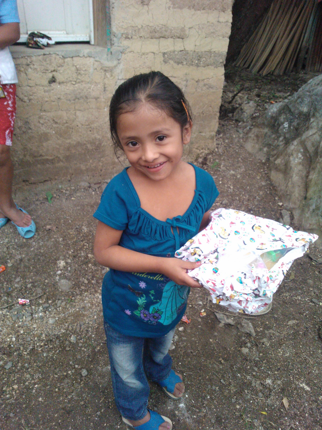 A little girl shows her appreciation through a big smile after receiving a gift and a hug for the celebrations